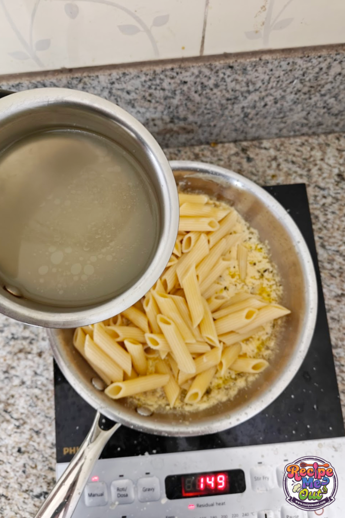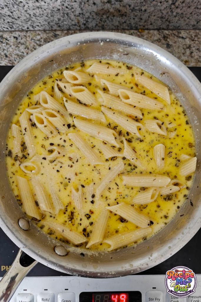 This is where everyone’s cooking style differs. Some people put less pasta water, whereas as far as my cooking style goes, I add a generous amount of it along with the pasta and cook it for sometime until the pasta has properly absorbed the water and eventually what you are left with is pasta wrapped in thick white sauce.