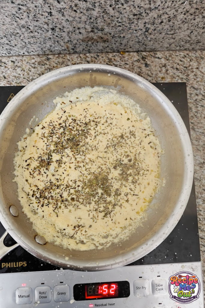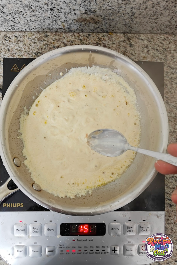 After that, add the grated parmesan cheese and cream. You might see that the butter is not getting mixed initially but keep stirring it and it will eventually mix to give a thick white sauce.