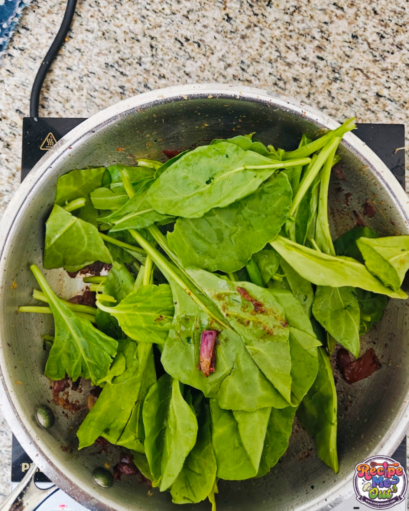 Mix thoroughly so the sauce blends smoothly with the coconut milk and coats the spinach evenly. Allow the mixture to simmer on low heat until it thickens slightly and becomes rich and creamy.