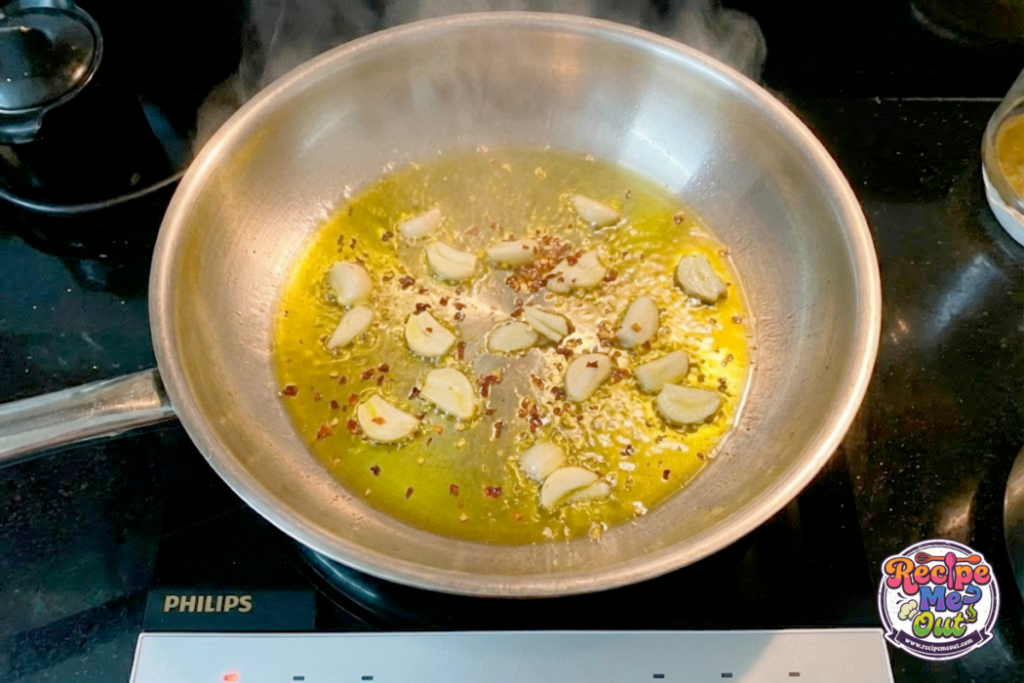 Add the sliced garlic and red pepper flakes. Stir gently and let them sizzle just until fragrant — about 30 seconds. If the garlic starts browning, turn the heat down. Golden garlic = yum. Burnt garlic = sadness.