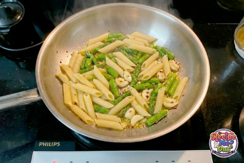 Add your drained pasta and asparagus straight into the pan with the garlic oil. Toss everything so it gets coated and starts smelling amazing.
